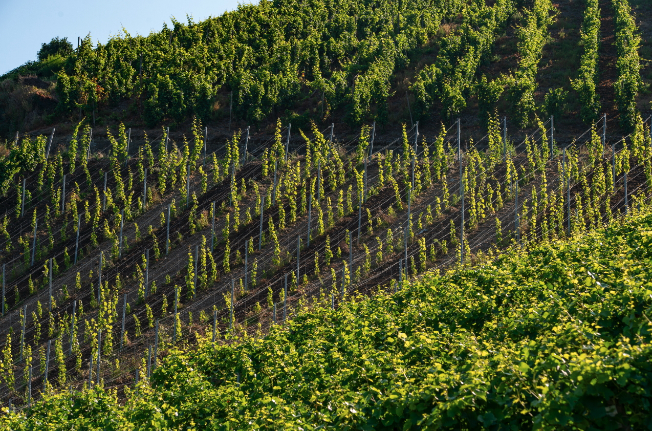 Die Weinreben stehen alle auf steilen Schieferlagen und sind großteils noch Wurzelecht und können selbstverständlich nur händisch bewirtschaftet werden.